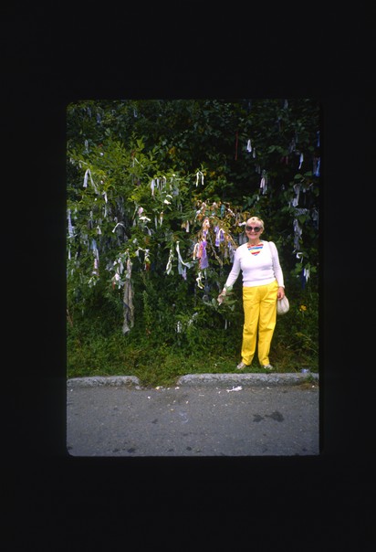 The lady in yellow pants is standing in front of a tree with ribbons on it. |