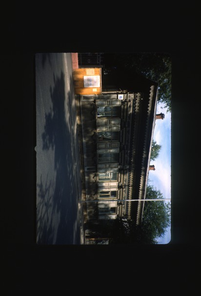 A single storey building with aged, wooden shutters for its windows, there is a noticeboard to the left of the building. |