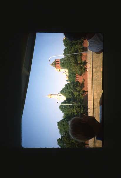 LOOKS LIKE BEAUTIFUL CHURCHES IN THE DISTANCE BEHIND A BRICK WALL! |