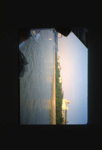 A walled show is barring access to green trees and a large building. |