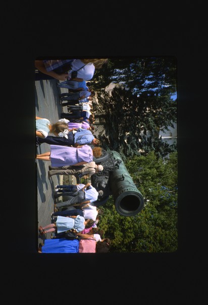 Seen of a park with full of greenery and antique item viewed by visitors. |