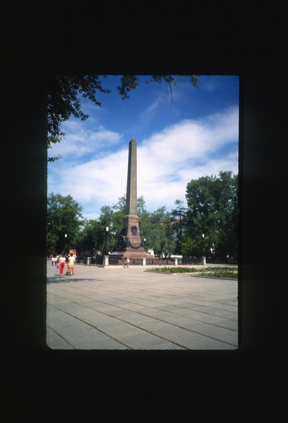 In the center of the walk way there is a very tall monument. |