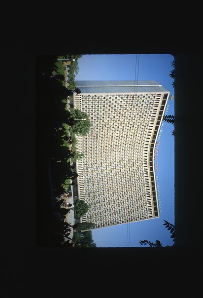 The tall, towering concrete building stood way above the tree-lines street. |