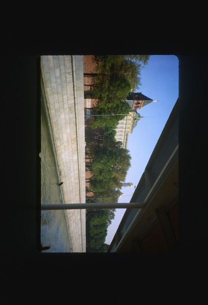 A beautiful view from train window with a tall building with plants in-front of building. |