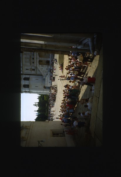 Large groups of tourists in an old building square on a sunny day. |