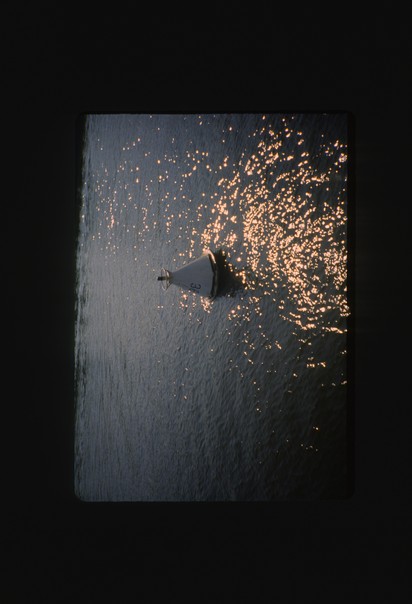 The sun is glisening on the calm water next to the floating anchor in the water. |