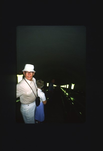 The man is wearing pants that are white in color and a hat that is white in color. |