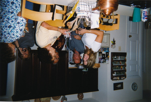 Happy people are gathered in a kitchen setting for a celebration, including a blond woman in a white shirt.