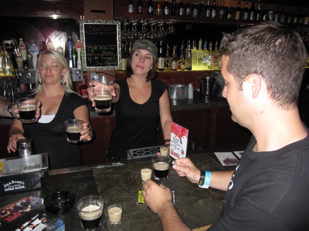 Two bartenders hold up their cups for cheers at a bar while a man sits looking down at his drink.
