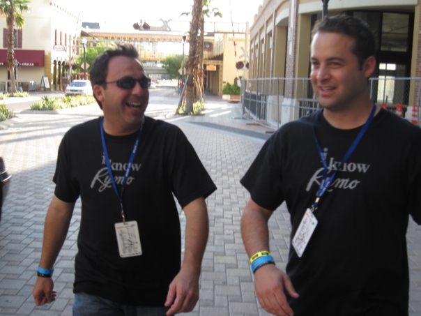 Two men walk on the sidewalk with blue wristbands, blue lanyards, and black shirts that say "I know Rymo."