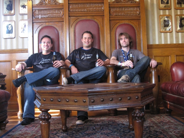 Three men looking relaxed sitting in chairs that look like thrones holding beers.
