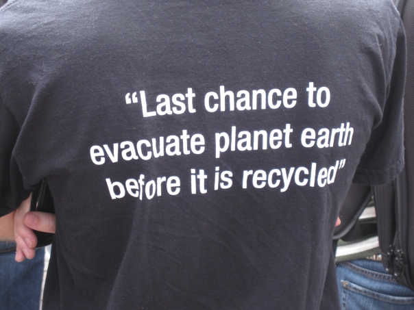 A photo of a man wearing a black T shirt with a humorous message about the environment.