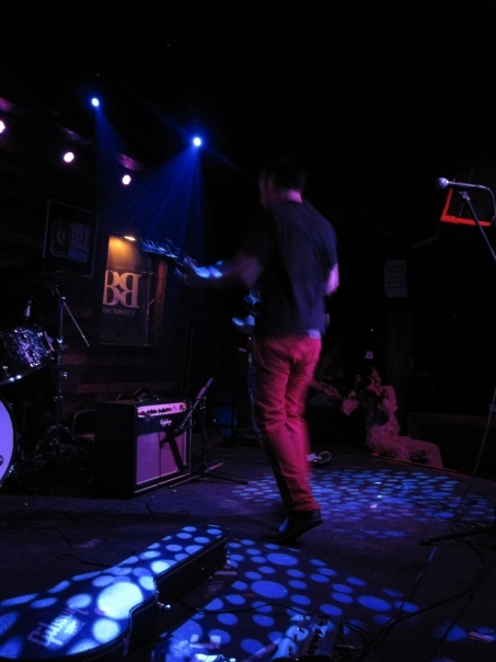 A man wearing red pants and a dark shirt plays a guitar on a stage that is lit with blue dots.
