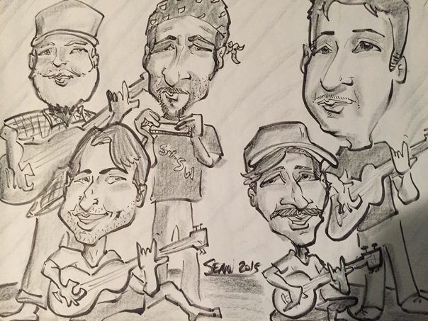 A cartoon drawling of a band showing four male band members playing different string instruments.