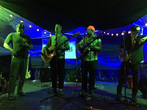 This looks like a really cool band of men playing at night.