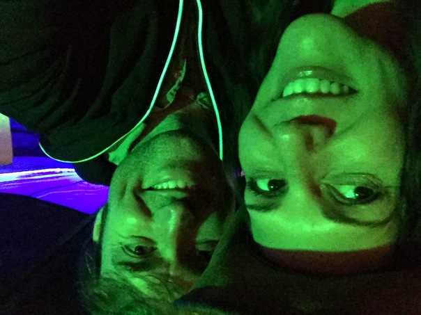 A green tinted picture of a smiling man and woman with purple light in the background.