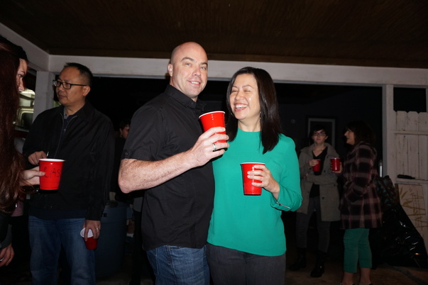 The beautiful couple are drinking out of red party cups.