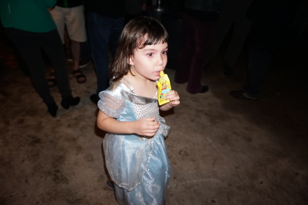 A little girl dressed as a princess while holding a drink in her hand.