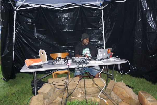 This young man is setting up his beats for the night in the black plastic tent with the jagged rocks beneath his table.