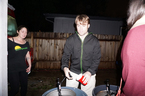 Three friends attend an outdoor party held in a backyard.
