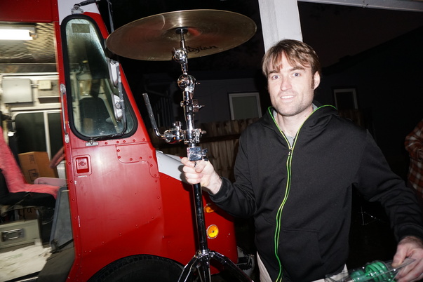 A man holds a stand for a cymbal which he appears to be loading into the truck.