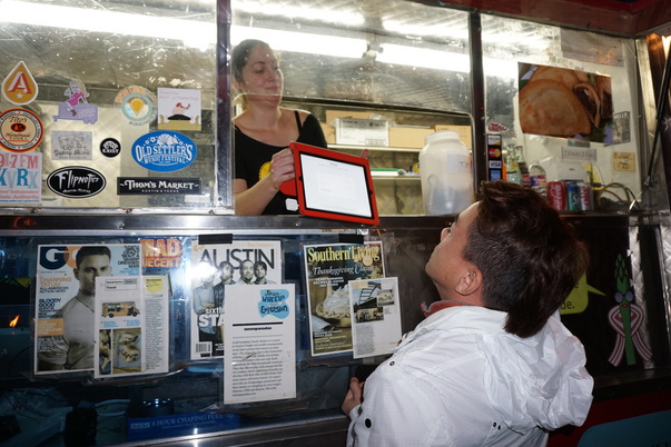 THE HEIGHT CHALLENGED MAN STRUGGLES TO SEE THE MENU ITEMS ON THE REF FRAMED MENU THE WORKER IS SHOWING HIM.