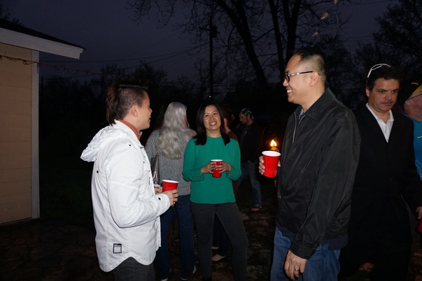 Three people stand amongst a whole group of people holding their red cups and have a wonderful conversation.