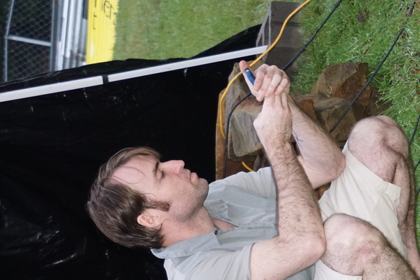 Hairy white man with receding hairline, gray collared shirt, and light shorts squatting while using a blue phone.