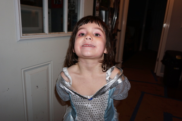 A small girl with long brown hair is wearing a light blue princess costume.