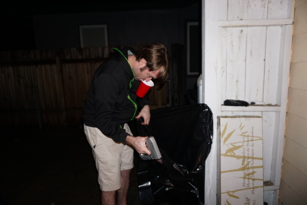 This is a photo of a man looking through a garbage bag outdoors.
