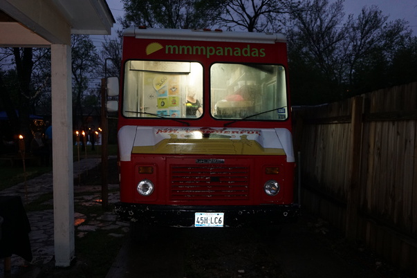 This is a photo of the front of a red mmmpanadas truck.