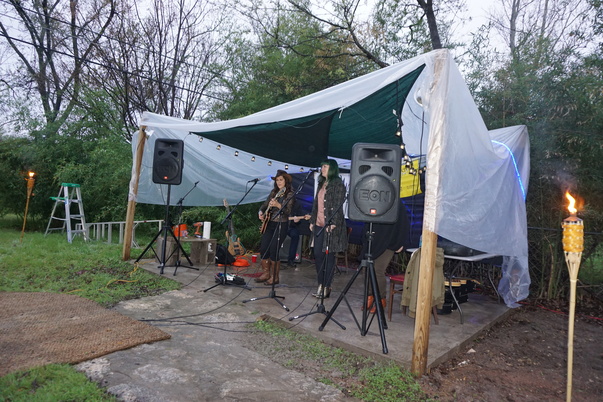 A musical act plays under an outdoor tented structure and two lighted torches are seen to each side.