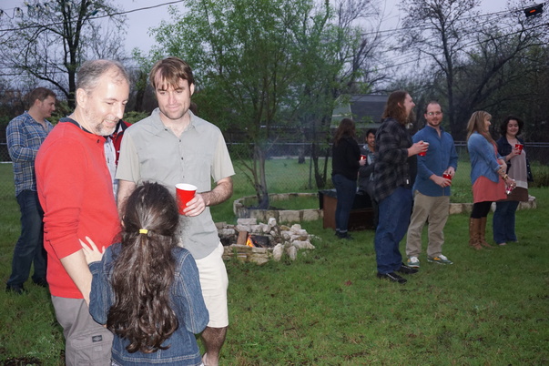 I see a little girl talking to a couple of adults at a backyard party.