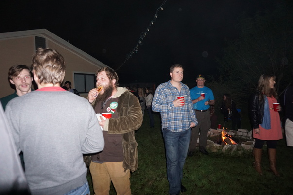having some snacks by the fire,at the outdoor gathering.