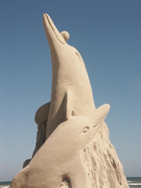 An amazing sand castle of two dolphins wrapped together. One of them is balancing a tennis ball.