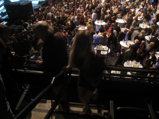 People are walking down the stairs at an event while people in the crowd below are watching the stage.