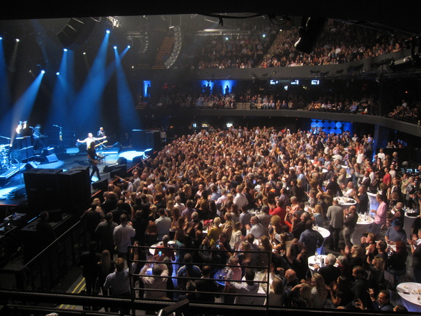 A band performs in front of a large crowd located in a circular, multilevel arena.