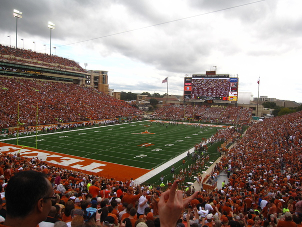 At the Texas Longhorns football stadium, fans are cheering and making hand gestures.