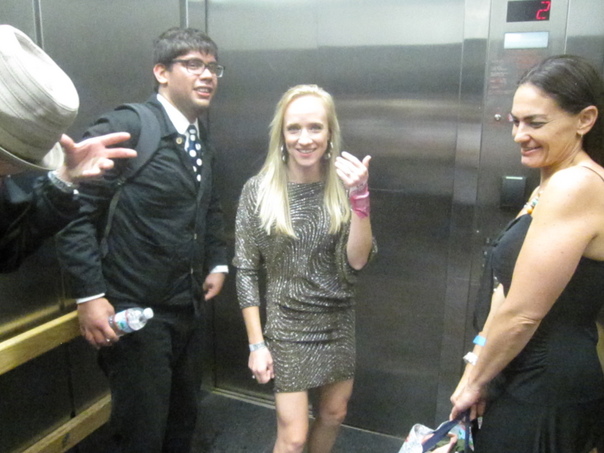 Group of people standing in an elevator while a lady poses for a picture.