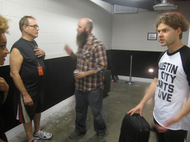 Musicians talk to each other backstage as they prepare to do a show.