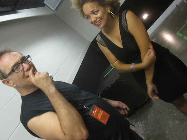 A balding man in a black t-shirt and glasses is standing with a woman with natural hair and a black dress.
