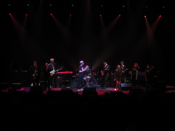 Musicians play on a dark stage with a red glow.