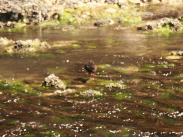 A bird stands in shallow water on rocks that are covered in green moss.