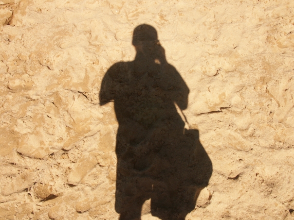 A shadow of a man talking on a cell phone appearing on rock.