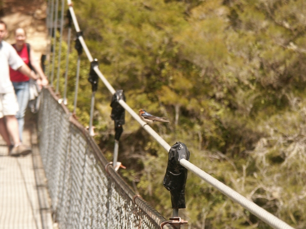 There are two men walking across a bridge as a bird sits on the bridge's rope