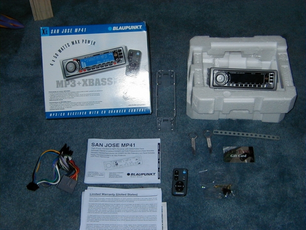 a car stereo, wires, installation tools, a remote, instructions, and a gift card all laid out of the box they come in