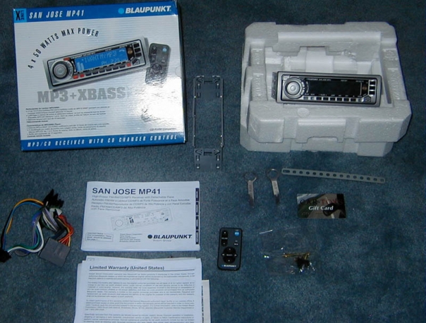 Car stereo contains all the parts needed for install and operation. Includes a gift card and remote control