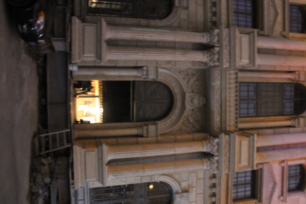 The picture is a sideways view of the front of an ornate building.