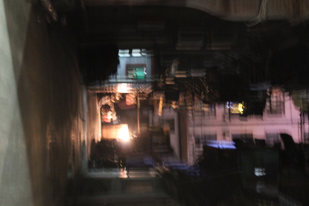 Although blurry, I contrasting, bright light shines in the empty and gloomy alleyway.