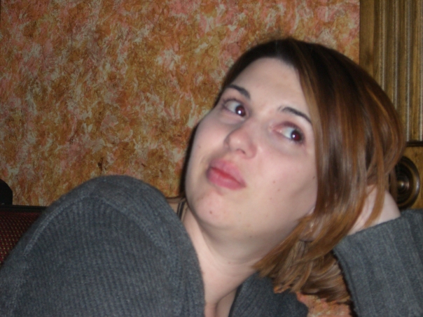 A young white woman dressed in grey holds her head up whilst being photographed.
